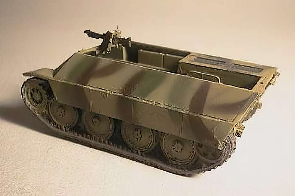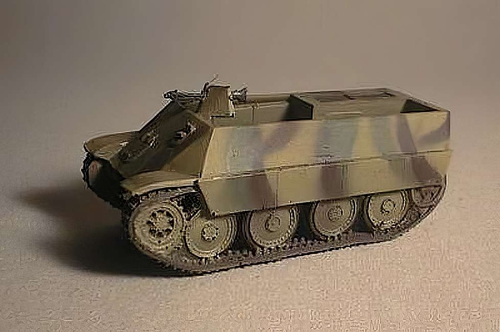 It was eventually decided to just order a prototype from CKD in Prague, maker of the Hetzer 38(T) Panzerjager. The CKD prototype was actually built in 1944. It was wider than the Auto Union model and heavier, being much better armored. Its front plate was 50mm, sides 30mm and rear 20mm. It retained the general layout with the open top and the engine in the rear, but disposed with the kugelblende for the front MG, wich was instead mounted behind an armored shield as carried by the SdKfz.250 and 251 halftracks. A rear mount for another MG was also provided.