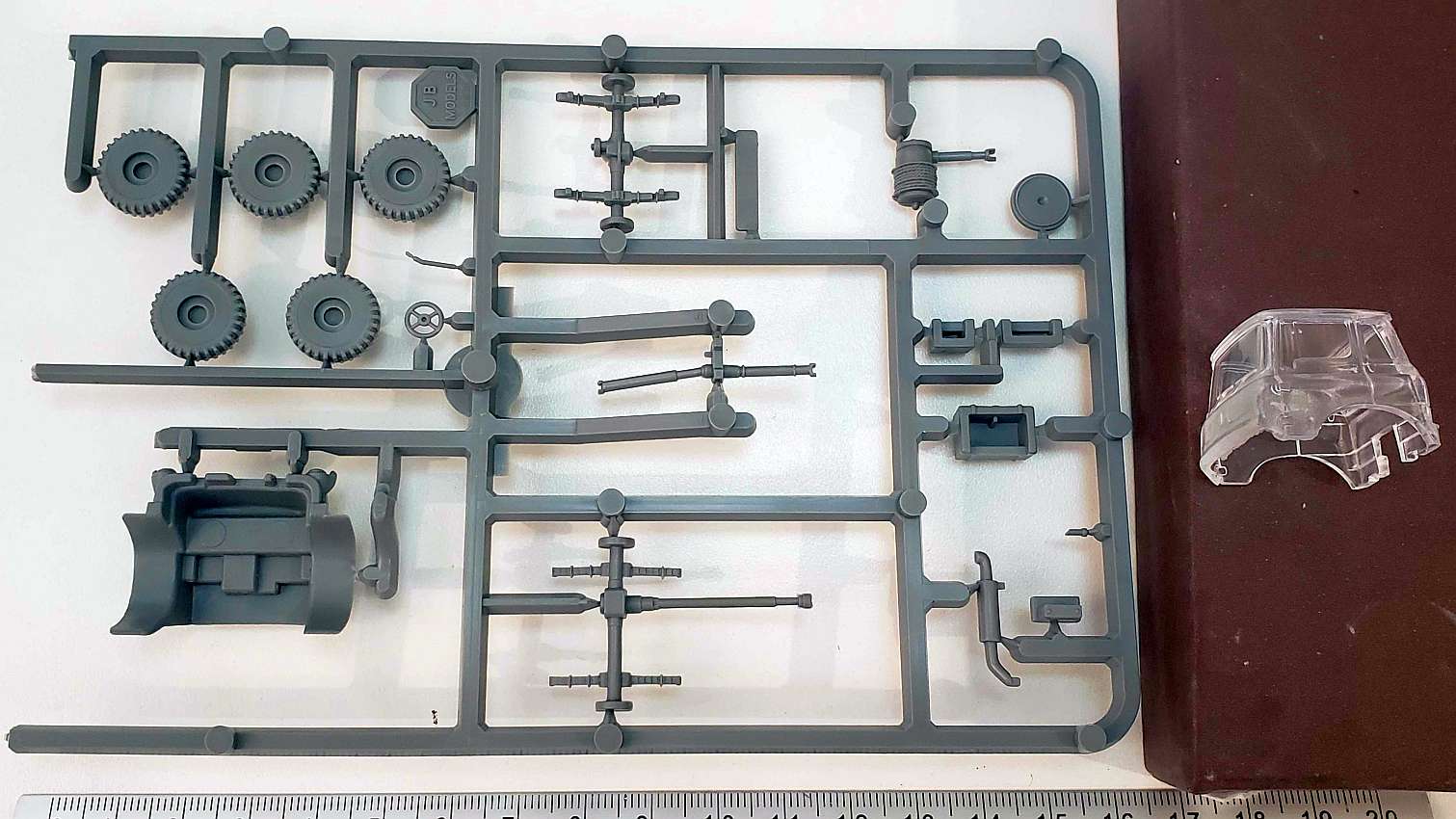 This kit comes in the usual familiar stout cardboard box with the contents in a re seal able poly bag. The outer covers front and back have the work art and colour illustrations for placing the red crosses on and measurements of the kit in mm. The kit comprises of 3 medium grey sprue and two clear ones and a set of decals. The total number of parts including the extra ones for the doors to be open and an extra lower floor pan are 45 parts, on the decal sheets there are enough for 4 vehicles with red cross markings and one with red crescent markings . A full guide to the recommended colours that can be used are listed along with ref to the Humbrol colour charts. The parts are clean and free of flash, sink marks or ejector pin marks, a blemish free kit. The model can be completed right hand drive or left hand and the rear doors can be open to show the fitted interior or a fully closed up option is in the kit. I have left the best information till last , once more John , has thought about this kit from a modellers point of view , the front cab is again in clear plastic and so is the internal dividing wall , all it needs is careful masking and then painting both inside and out and the windows are done . You also have the lights on the top of the vehicle in clear plastic ready for the correct Tamiya colours to stain them. Please let us have no comments about the wrong style of tyres in the kit, in my local scrap yard there were at one time over 50 of these ambulances and at least 4 different types and styles of tyres were fitted including civilian. Overall, yet an other winner from John who is listening to modellers and providing models of very good quality at a reasonable price. This is a pre build up review but I can see no problems when I build it up. Many thanks to John for supplying the kit for review. Look for press announcements as to availability in your country