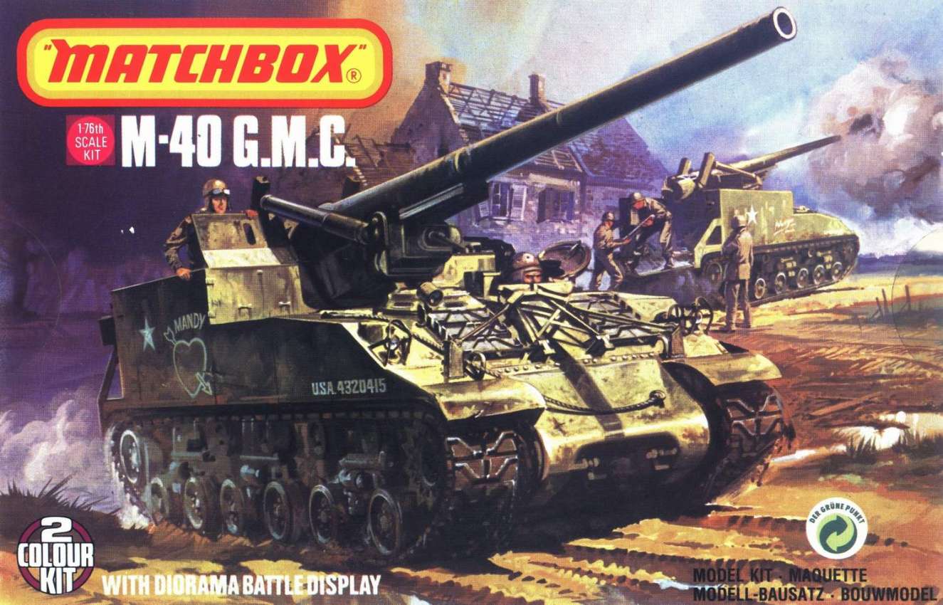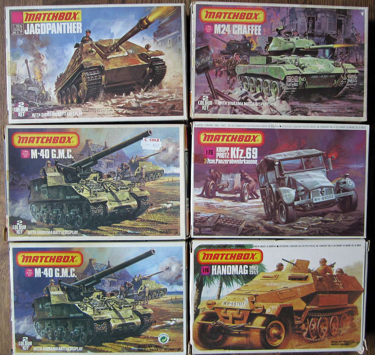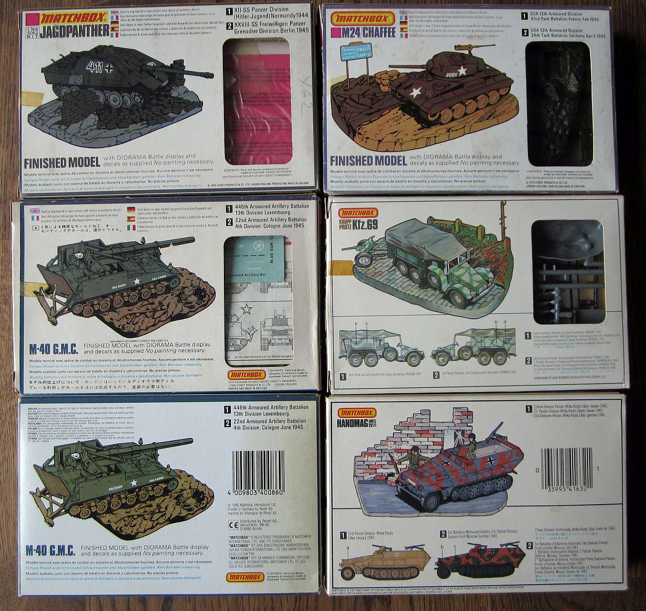Matchbox box variations - The pictures show 6 variations; the top row (Jagdpanther and Chaffee) are dated 1974; The second row (M40 and Krupp Protz) are dated 1978 and the bottom row
