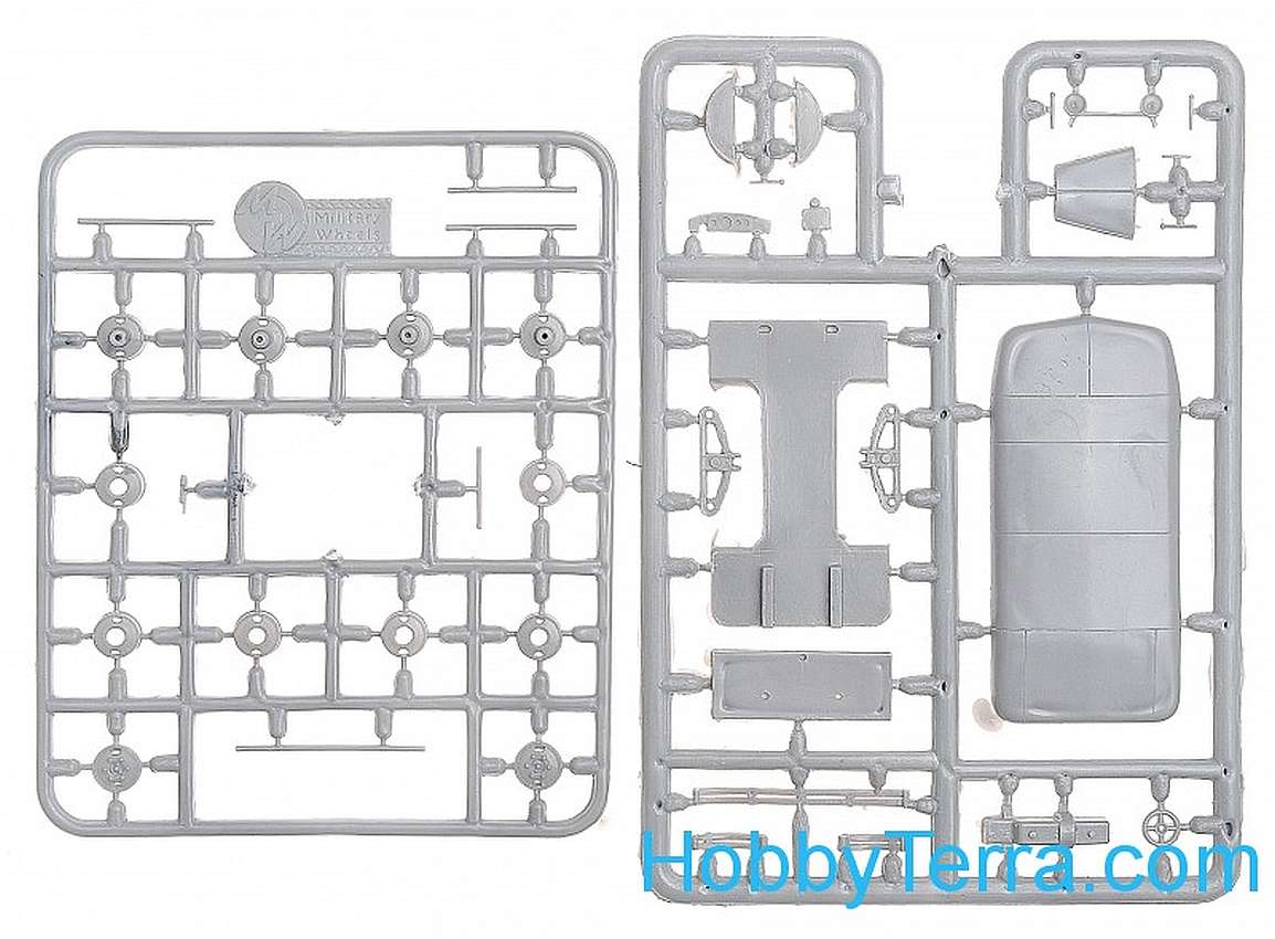 Both kits are identical...containing the parts to do either version. There are four grey plastic sprues of 98 short run injection moulded parts, plus a fifth 'clear' sprue of 11 parts. While there's no engine, there is a sump and transmission, separate chassis, axles, differentials, suspension, exhaust and drive shafts. The driver's compartment has seats, instrument dash, steering wheel, gear sticks and hand brake. Wiper blades, mirrors, aerials, bumper bars and even a jerry can are provided as separate items. The rear section of the M-98B version has slatted wooden sides and benches, while the M-1025 version has an enclosed top with a 'cut out' for a machine gun (supplied)