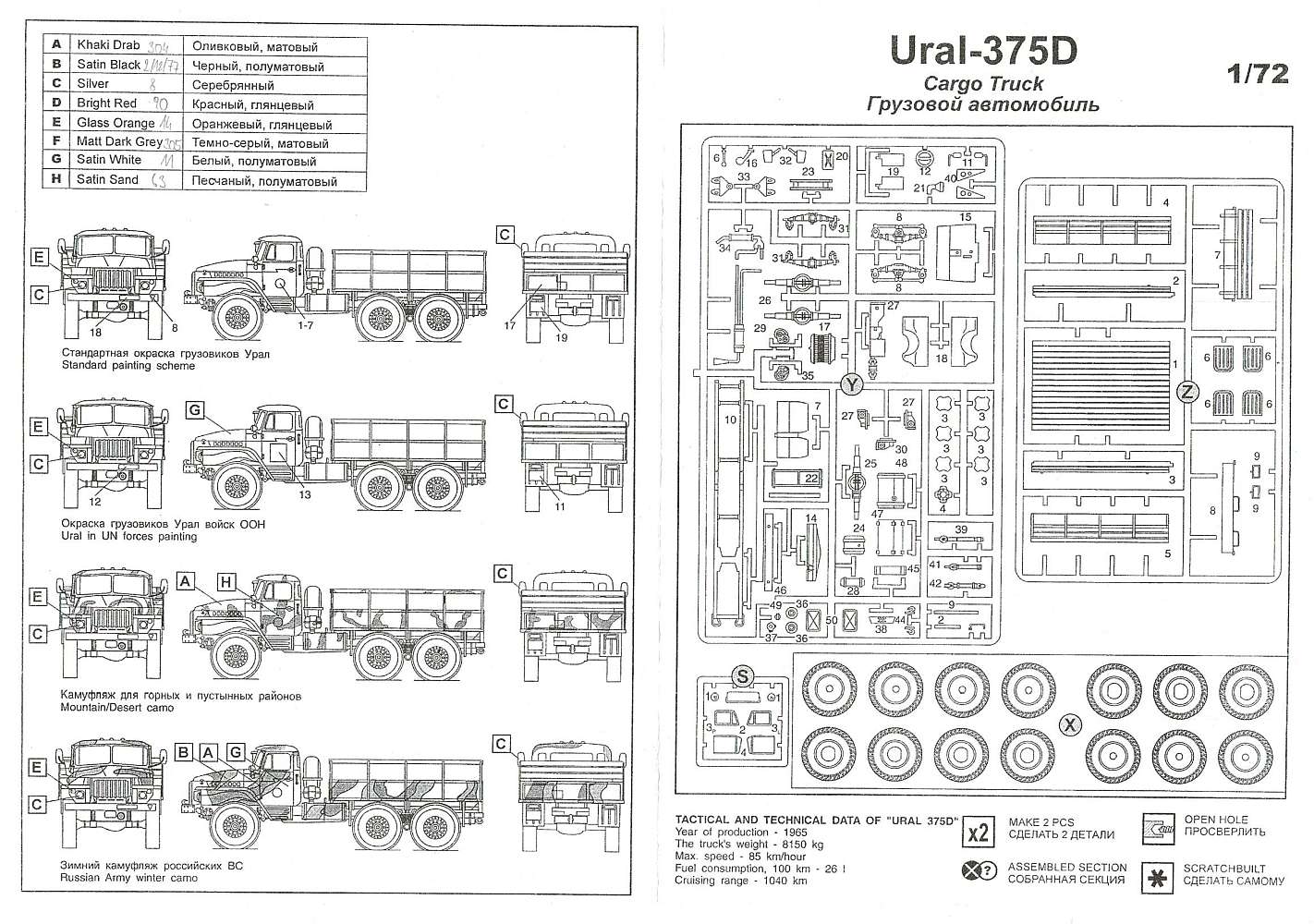 Yet another version of the Ural truck from ZV...this is the same as the tanker/truck versions except it has the 'command' post on the back instead of the tank/tray. There are 118 injection moulded parts, including 12 in clear plastic (windscreen, windows, etc.)...as well as a small decal sheet with markings for two vehicles. As with the other two kits, detail is excellent, especially the chassis and cab...but there's no engine and nothing inside the 'command' section (but the doors are moulded closed).