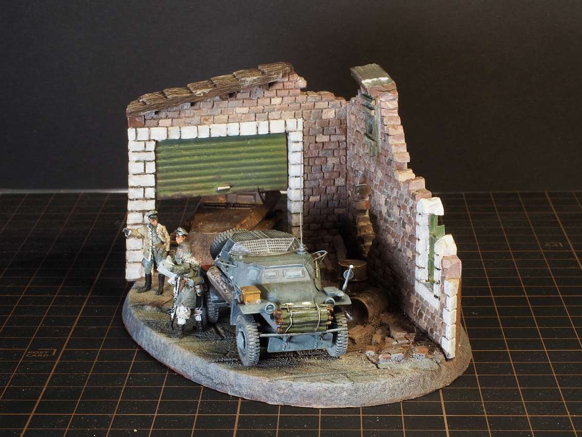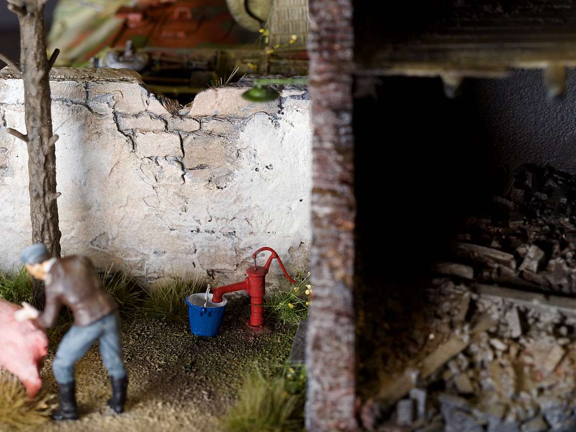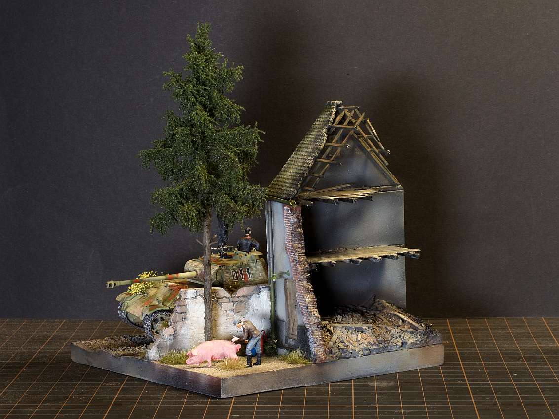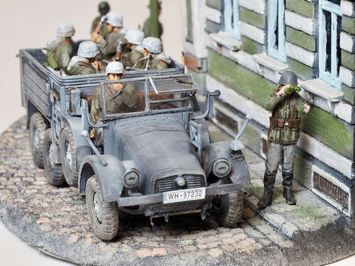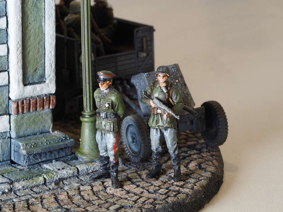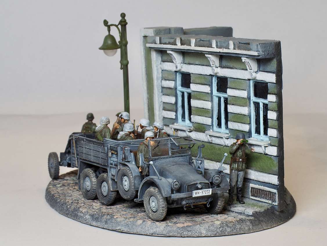 Built model en diorama by Walter Hendriksma - Dragon Nashorn, Germania Figuren Veldkeuken poppetjes, MIG Duitse mechanicus, Preiser figuren, DIO72 Russisch huisje, FIRMA49, Germania en Geoffey etenswaren, Plus een 3D veldkeuken