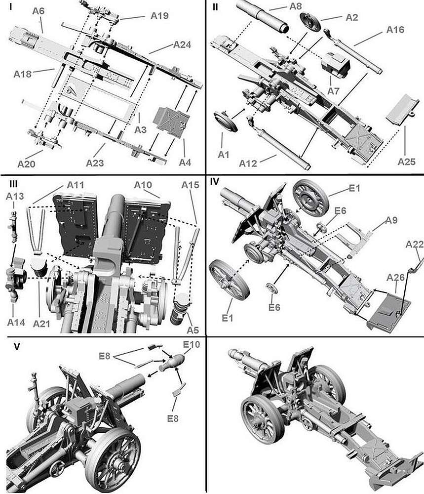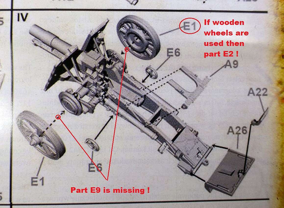 FirstofFight copied the old instructions (kit no. 083 and 102) with no changes for this kit. The part E9 is missing in the drawing/instructions (not in the kit). And in the instructions they say you need to put the wheel E1 which is a metal one instead of the wooden one (part E2)