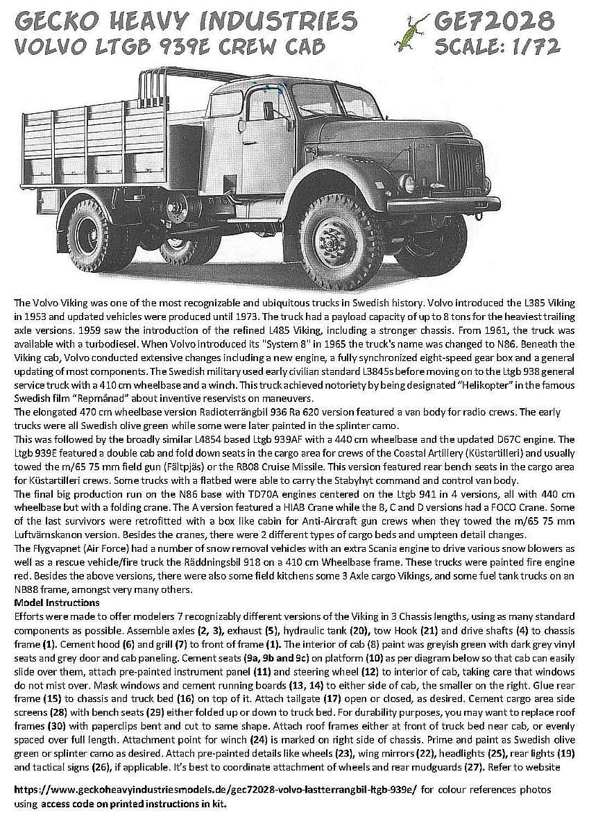 Kit 72029 - Volvo Lastterrängbil Ltgb 941A B D (with Foco or HIAB Crane and Alternate Artillery Crew Cabin)