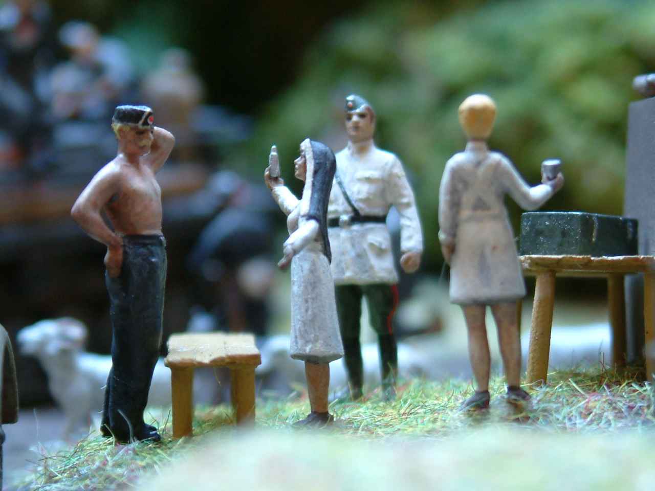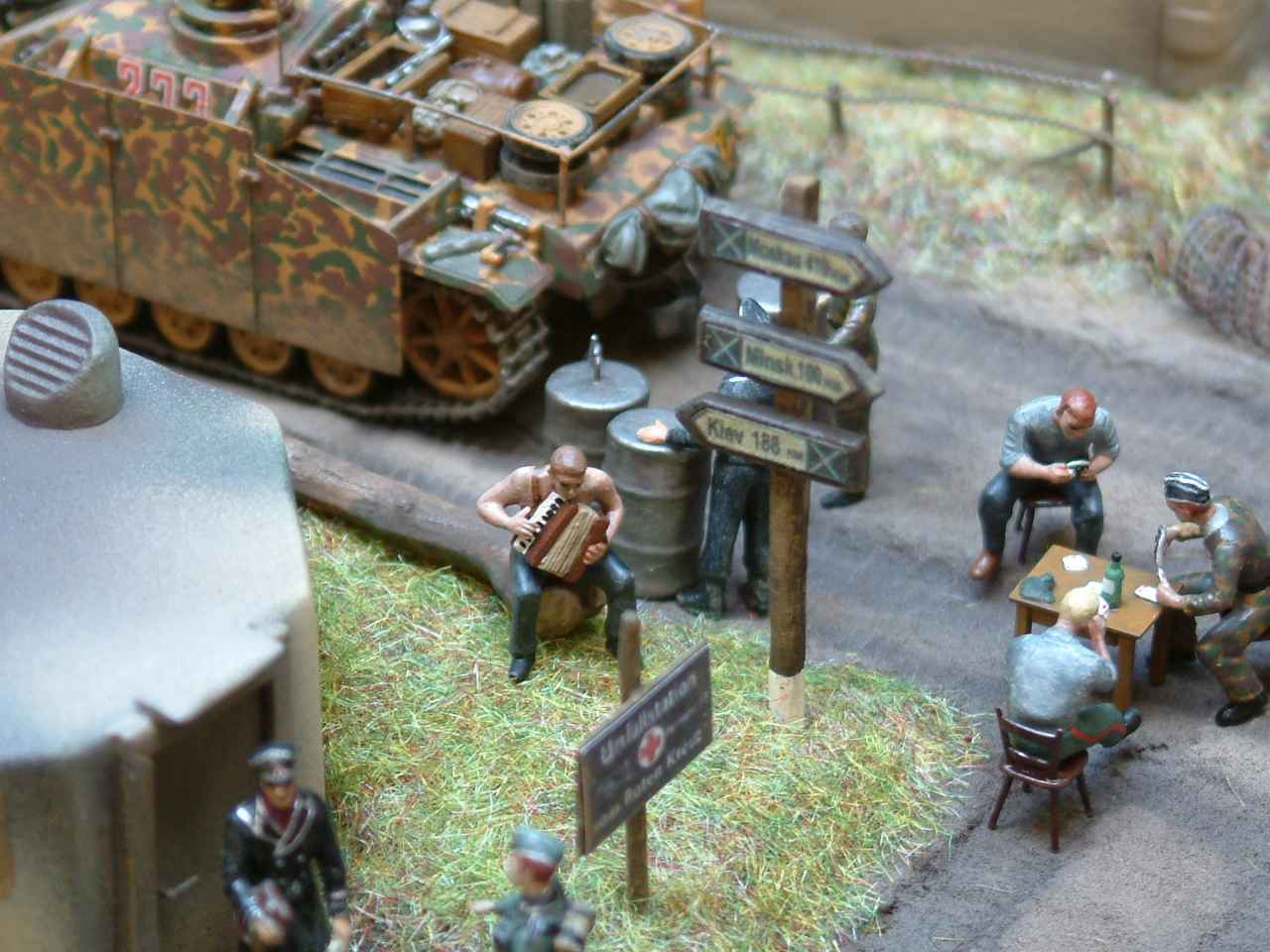 16th Panzer division and Red Cross bunker complex. This diorama shows the ESCI Sturmgeschütz and Sturmhowitzer III after I added scratch built luggage racks and the usual mess these mobile guns used to carry around. The ESCI models are great fun, and you can build two versions: the long barrel gun, which was used as anti-tank gun and has a hand painted ambush scheme to conceal the tank in the thick undergrowth where they waited for enemy tanks. The short barrel howitzers were Panzer Gray as a rule, to save paint or because it wasn’t considered necessary to re-paint them in yellow as they served in the rear of the front. Both tanks are from the late 16th panzer division, formed in France in the spring of 1943 after the early 16th PD was utterly destroyed at Stalingrad. You can tell the difference because the unit’s marking - a yellow Y - is painted on a black shield with a yellow outline as a sign of mourning for their fallen comrades at Stalingrad. In late 1943 16th PD returned to the Eastern Front where they saw heavy action until the end of the war. I thought it to be an act of kindness and mercy to depict them on holiday in Russia at a Red Cross bunker complex, even though war is never fun, judging by the size of the injection needle one of the nurses is about to use, one the soldier having second thoughts. The Phanomen Granit 27 ambulance is a JV Model resin kit, donated by Lancier hobby shop in Gouda for the benefit of my pleasure of building this kit, thanks again! The figures are from Preiser and ESCI, except for the nurses, who are of unknown origin as I got them from a boy in my neighbourhood when I was six years old.