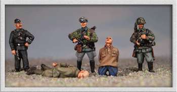 Due to the choice of uniforms, and the location of the eagle insignia, two figures are Wehrmacht, and three Waffen-SS, of which one in camouflage smock.