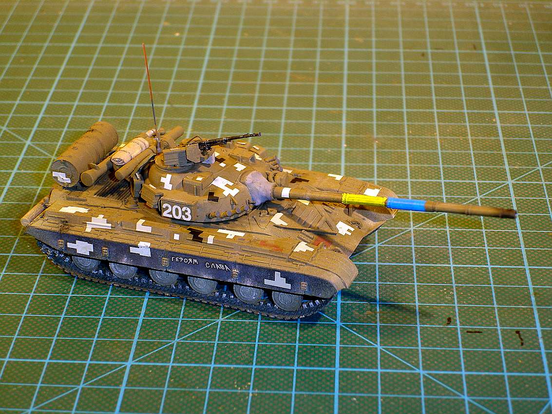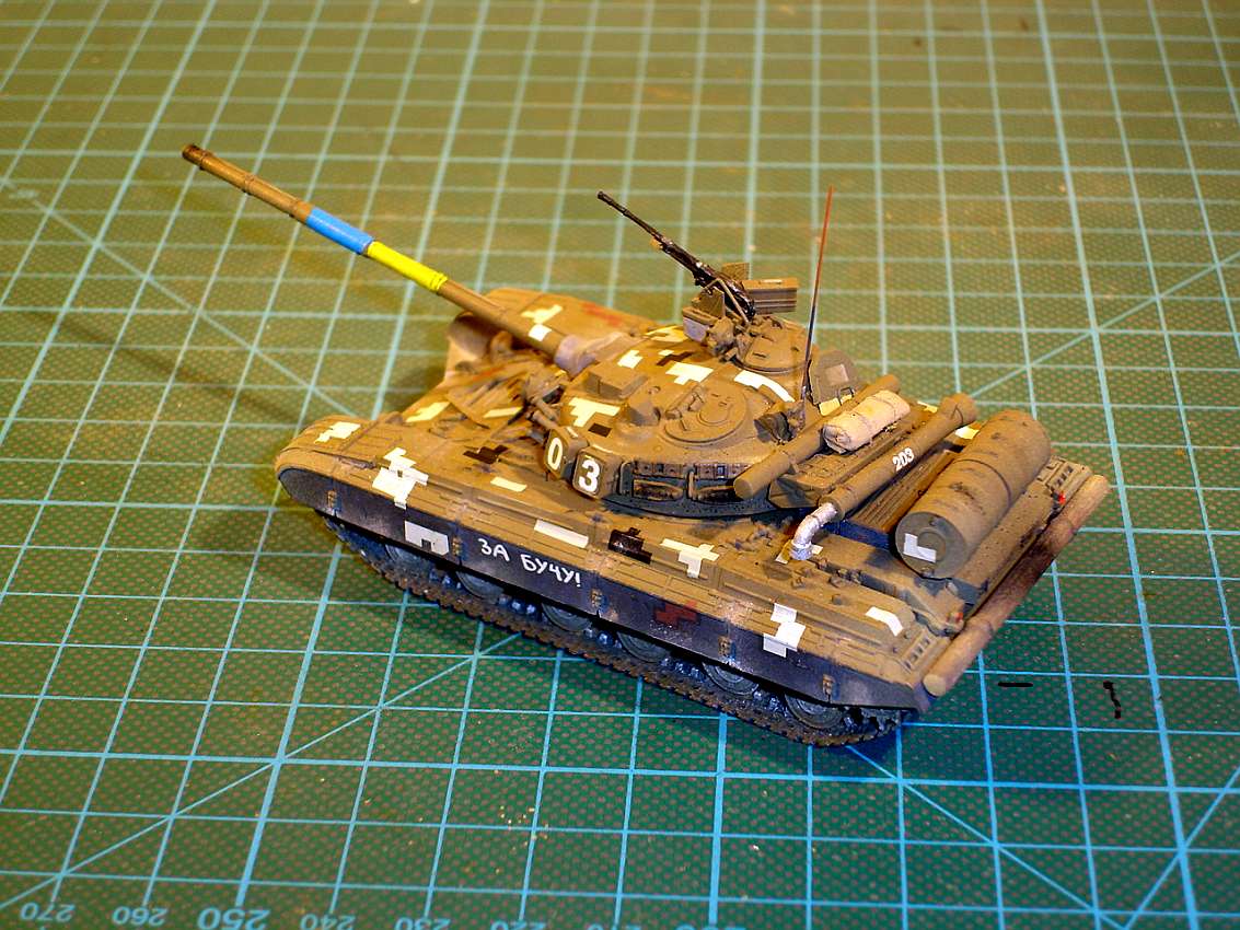 A T-64 in the colors of Ukraine. The pixel camouflage is decals from the new editions of the ICM truck models (URAL, ZiL), which are delivered under the slogan