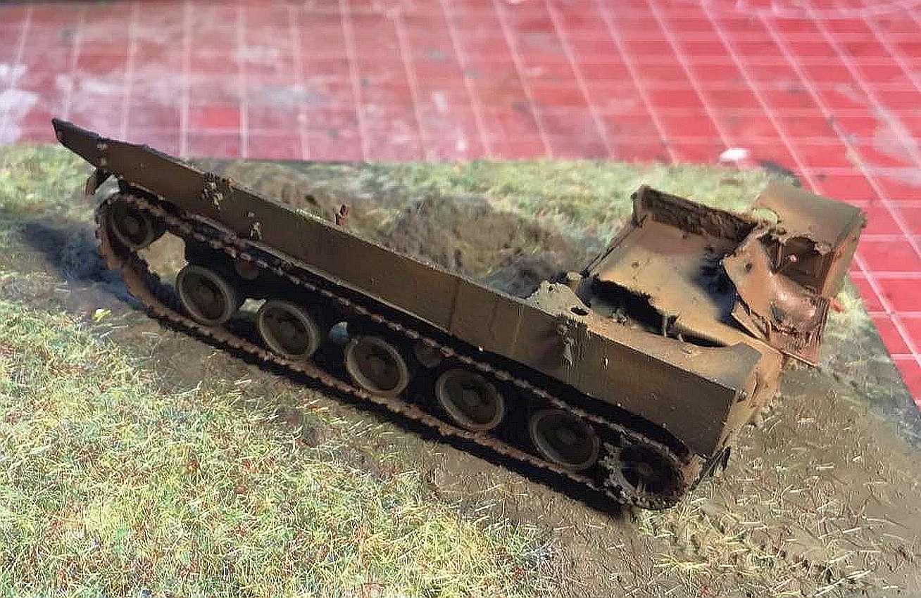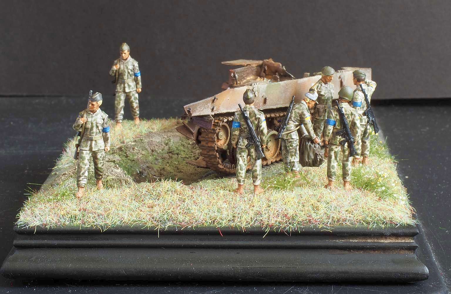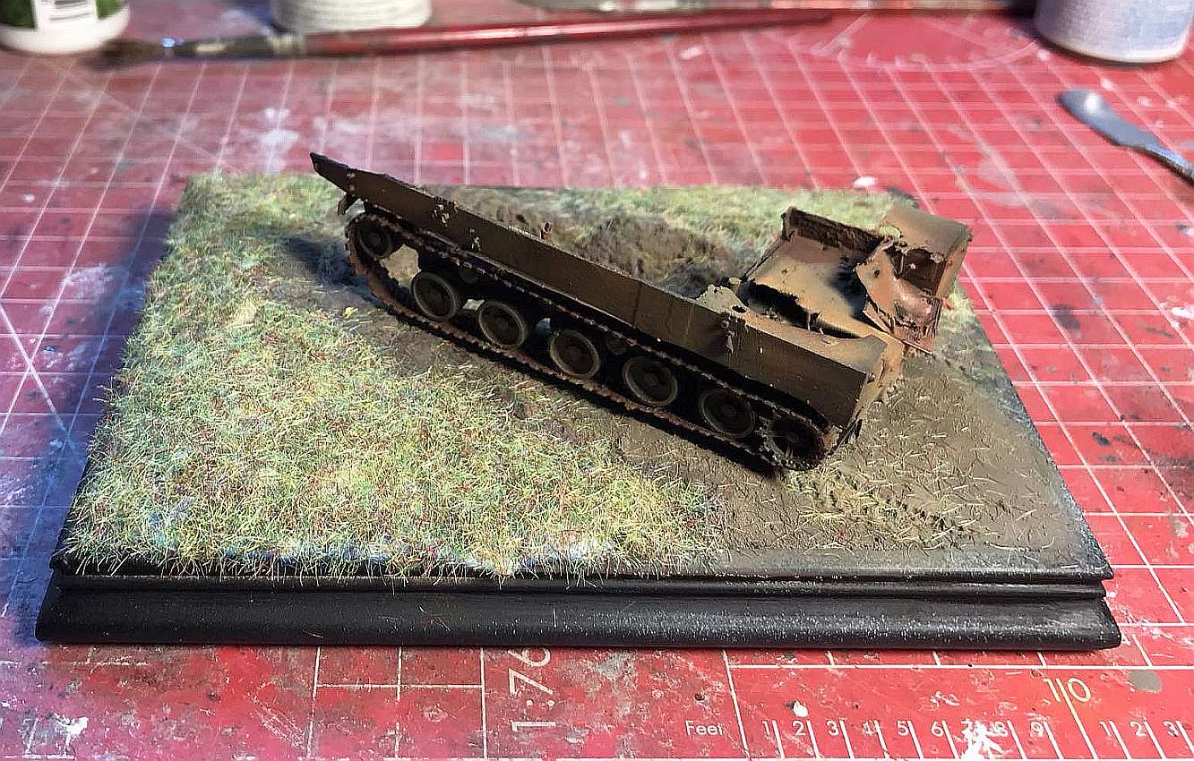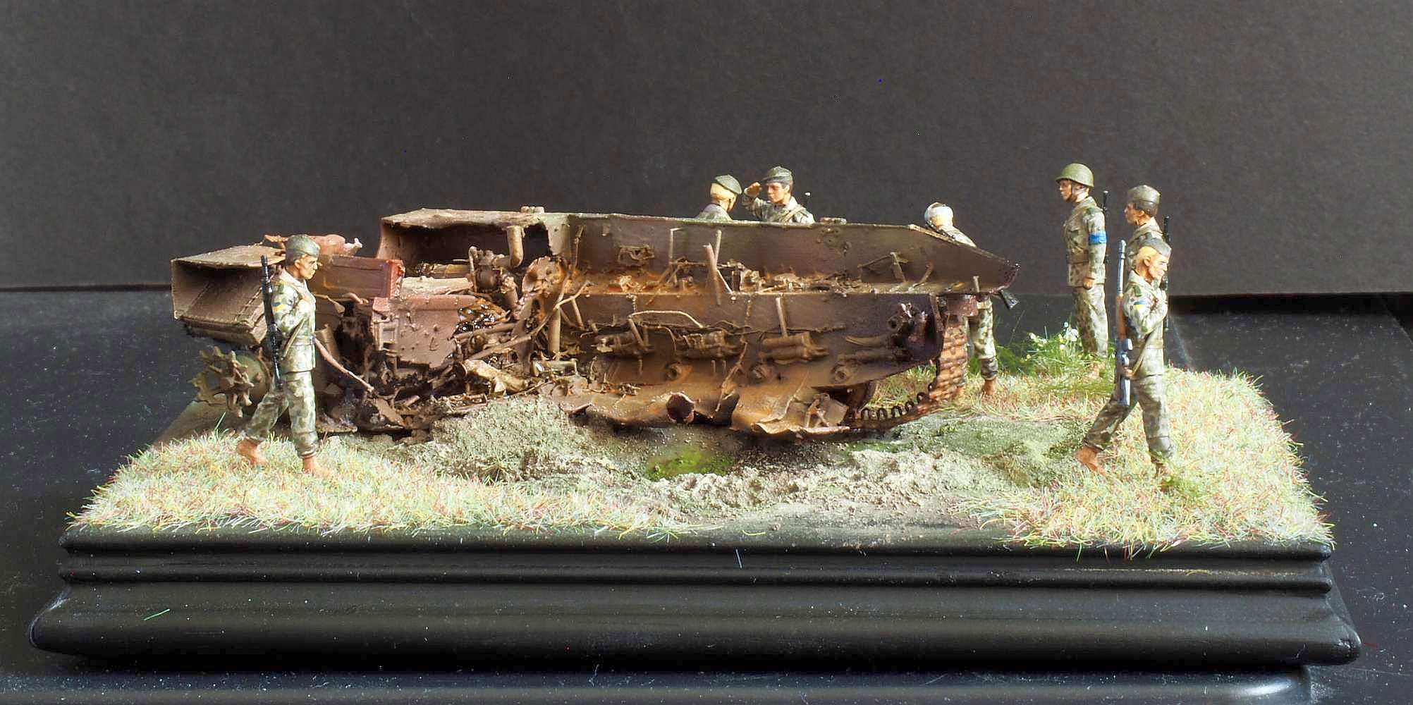 This is a new-ish 3D printed model from FC-ModelTrend, a destroyed Russian BMD-3. I replaced some of the smaller details and made a small scene, representing