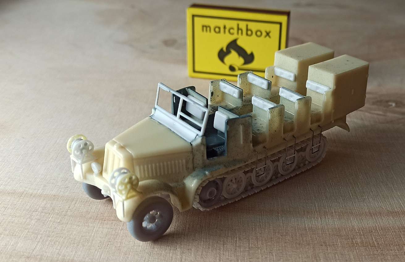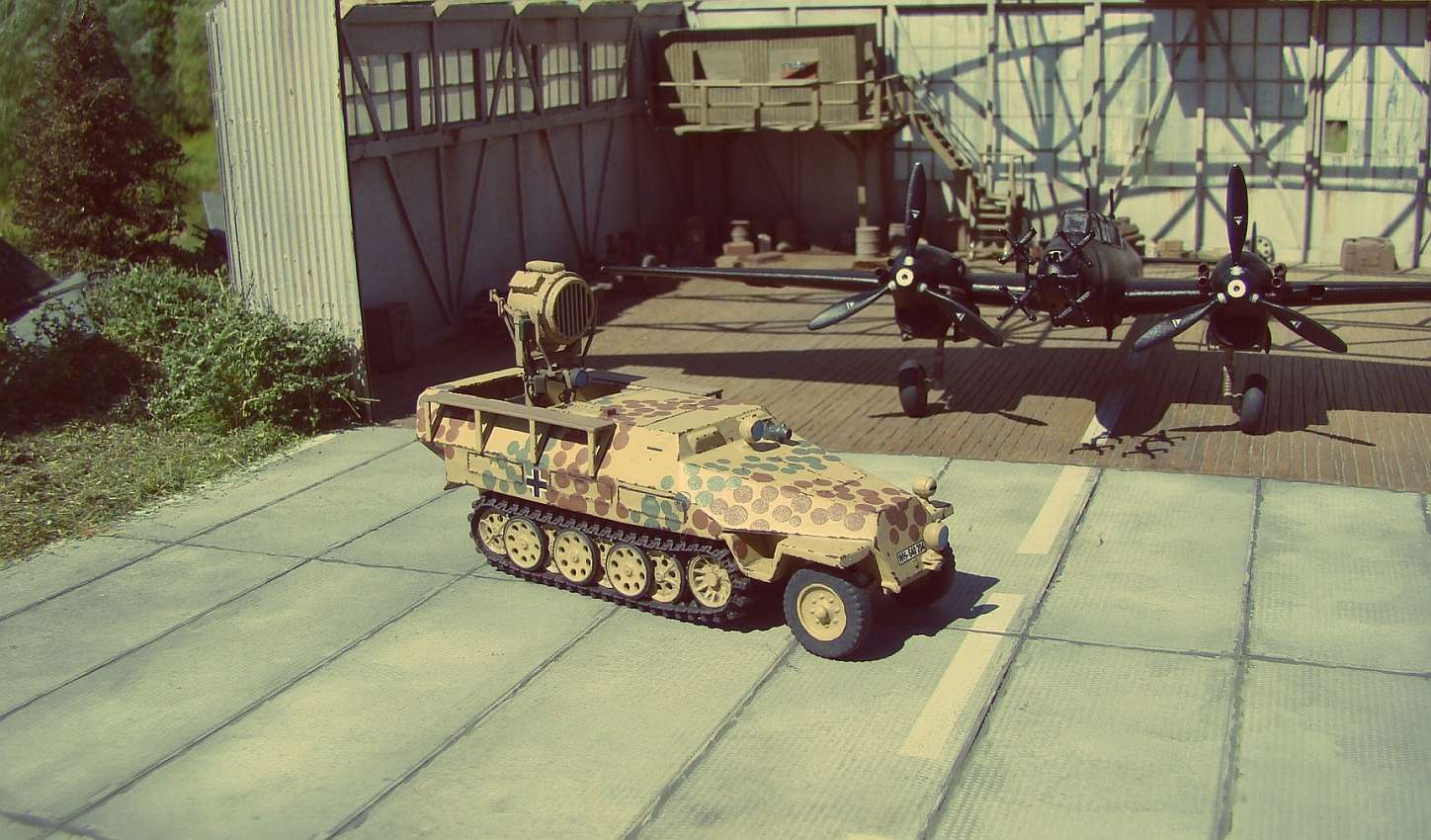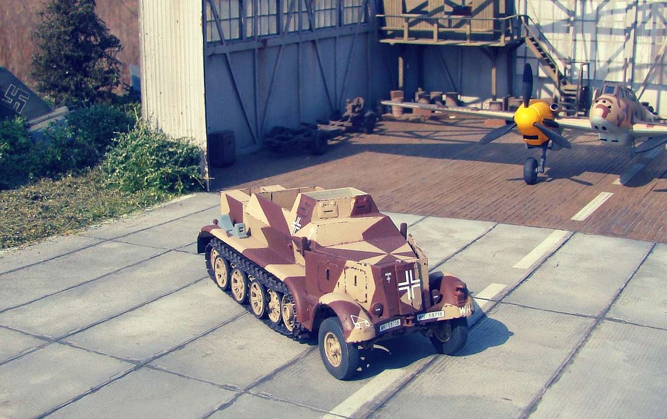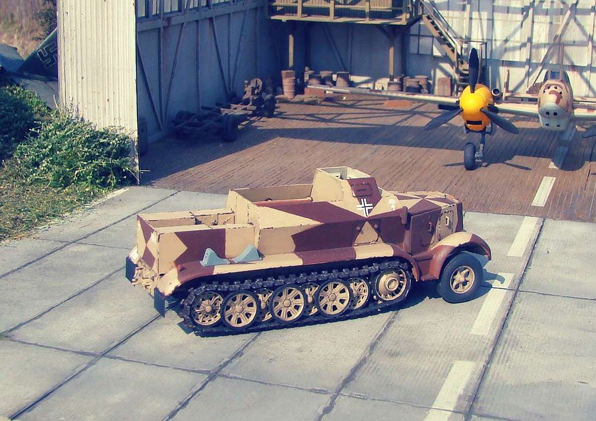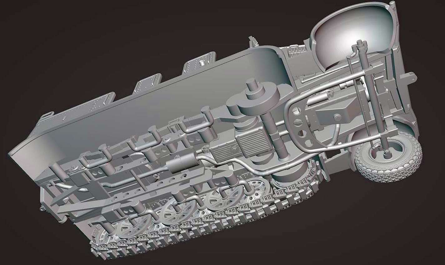 It never existed but in the world where there is growing numers of fictional projects. It's early version of SdKfz 251 with front from SdKfz 247 and it has short 75mm gun on the top. The gun is metal from RB