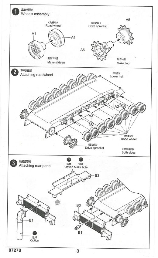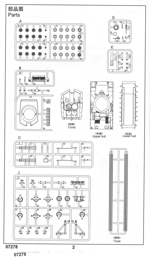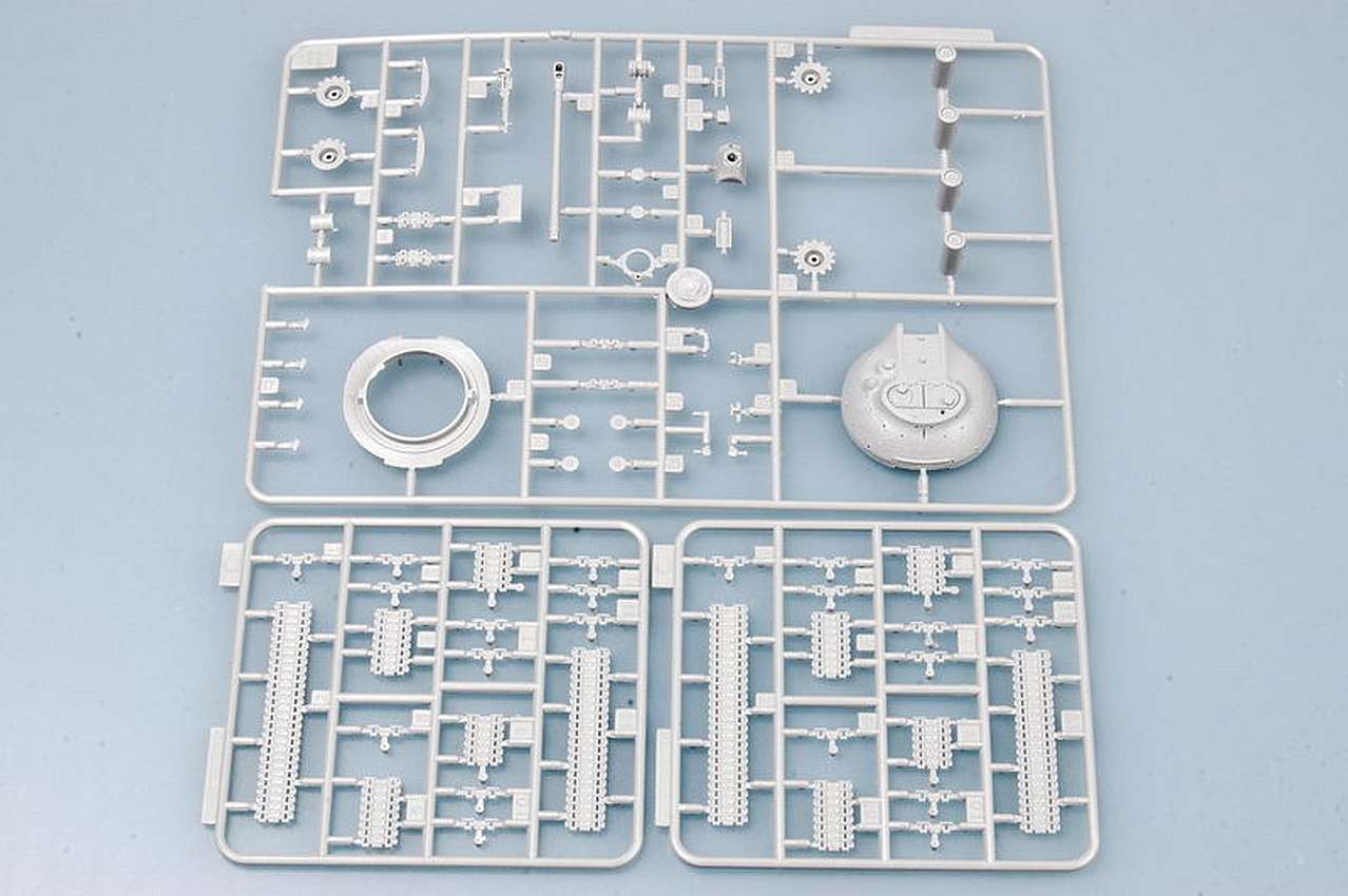 The kit supplied doesn't seem to match the box art. The instruction manual, sprue and the CAD picture show a late conical turret. The box art show a straight-sided turret. I'm sure the late turret is correct, meaning the three main turret types are available between this, the 7150 welded and the S-model T-35. The 7150 two-hatch turret is a straight swap for the T-35 single-hatch, the conical 7151 turret gives a start to a late T-35 although many other changes are needed - (Note: Adrian Camp)