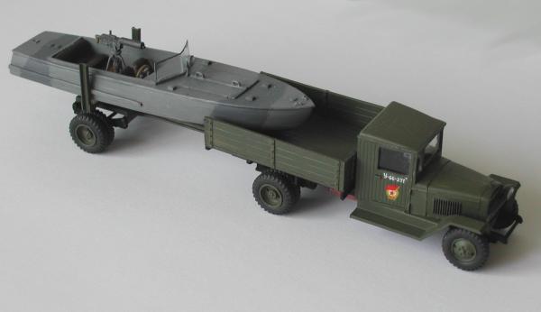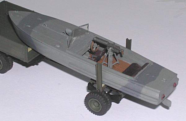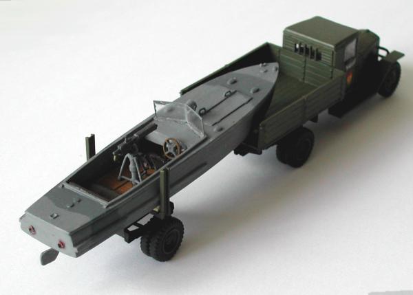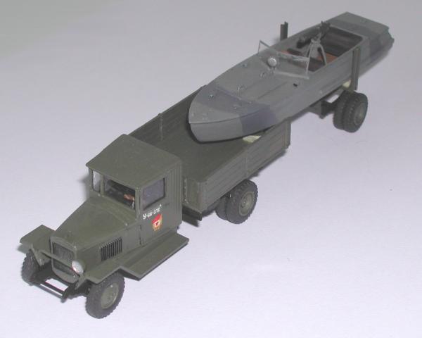 Von der Firma TAPO konnte ich die Resinteile für diese Fahrzeugkombination des Herstellers AER bekommen. Die Teile für das Boot waren ja noch ganz gut, man konnte etwas damit anfangen. Leider war die Lafette für das Maxim - MG nicht vorhanden, sodass sie im Eigenbau erschaffen werden musste. Bildmaterial war Gott sei Dank in der Bauanleitung vorhanden. Auch die Inneneinrichtung des Bootes musste überarbeitet werden. Der Anhänger erwies sich in seinen Einzelteilen als Klotz und war nicht akzeptabel. Mir blieb also nichts anderes übrig, als den Nachläufer aus vorhandenen Ersatzteilen und entsprechenden Plastikprofilen von der erwähnten Firma aus Berlin selbst zu bauen. Die Puffer auf der Ladefläche des ZIS 5V und der Auflage des Anhängers sind übrigens richtiges Holz. Wozu hat man als Raucher Streichhölzer in der Schublade, falls das Feuerzeug einmal den Geist aufgibt?