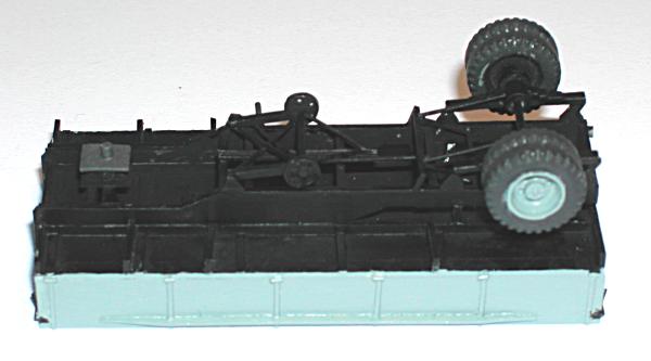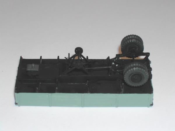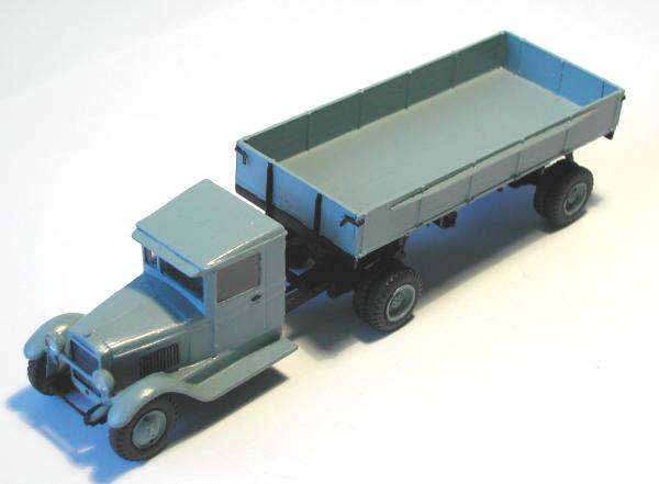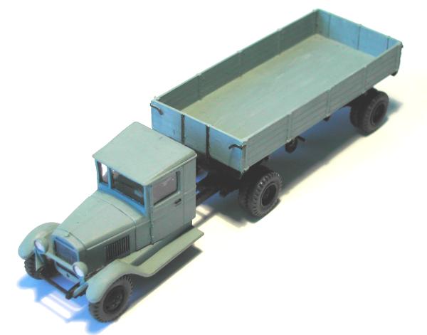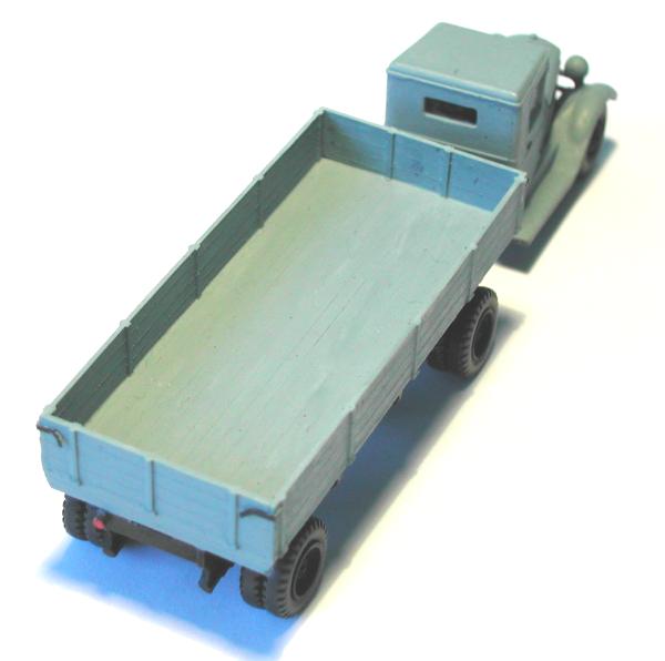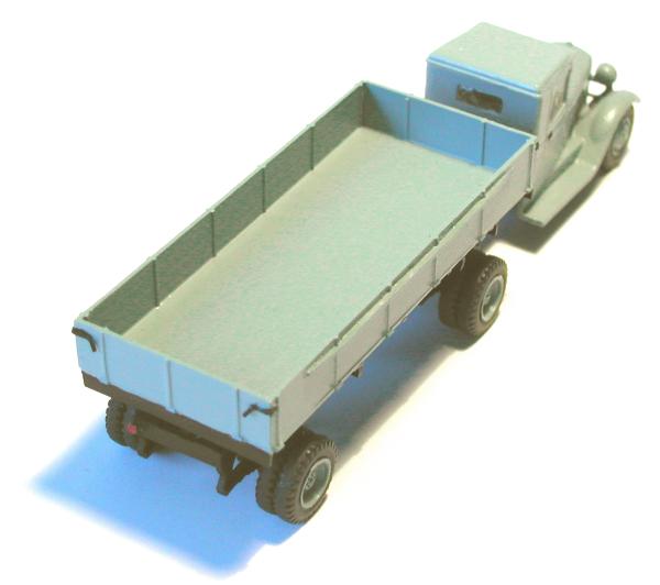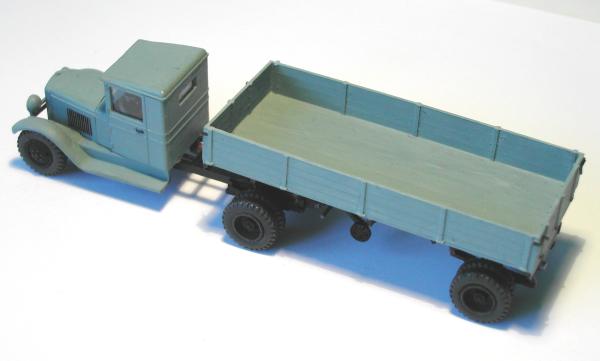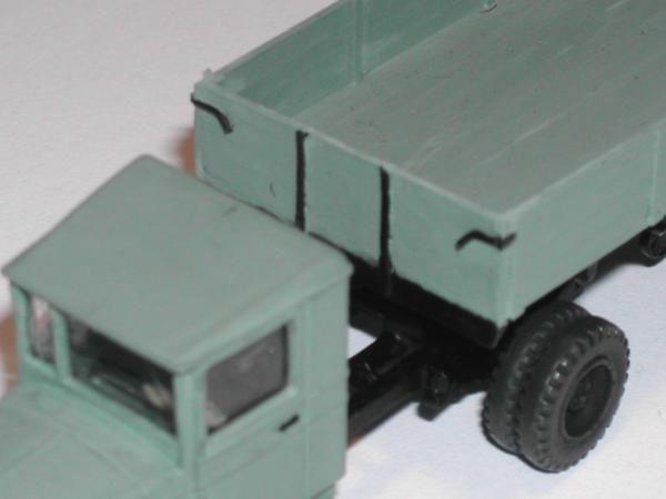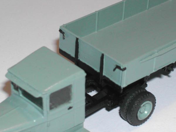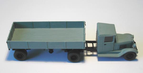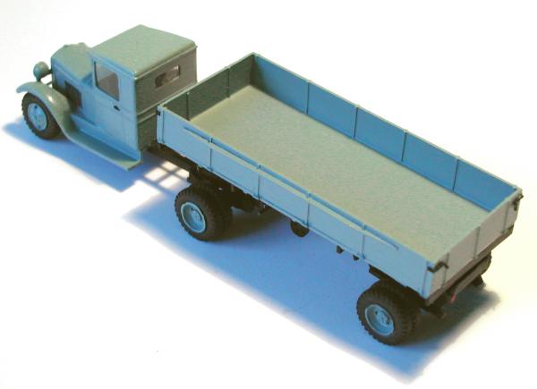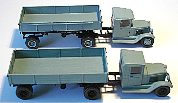 Ich habe versucht, mit den beiden Modellen die entscheidenden Unterschiede der Gespanne ZIS 10 mit dem Auflieger PP-1012 sichtbar zu machen. Die Zugmaschinen entstanden aus den Bausätzen vom ZIS 5 der schon genannten Hersteller. Entsprechend den Unterlagen wurden die Rahmen gekürzt und der Sattel aufgebaut. Die Nachläufer entstanden im Eigenbau nach einem Riss aus der ukrainischen Veröffentlichung zu den ZIS - LKW sowie Fotos aus dem polnischen Heft zum Thema. Das Bastelmaterial lieferte die Restekiste und das Materiallager in Form von Platten und Profilen aus Polystyrol.