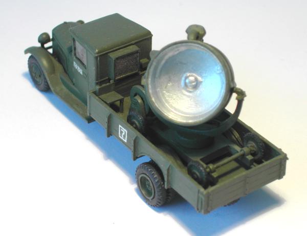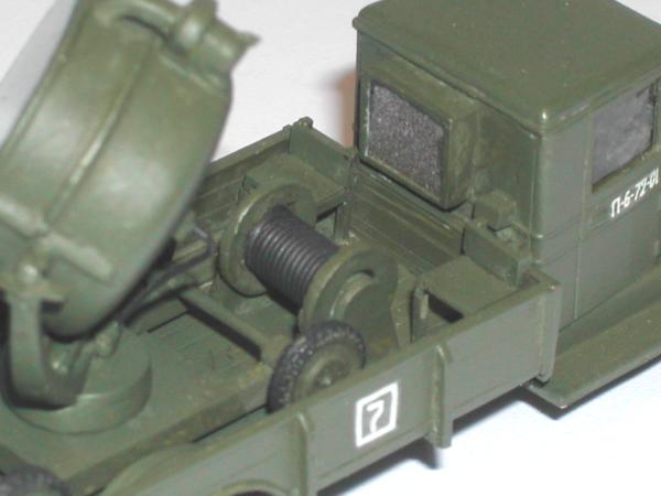 Entsprechend dem neuen Radstand wurde zunächst der Rahmen verlängert und die Aufhängungen für die Hinterachse an die richtige Position geklebt. Fahrerhaus usw. blieben gegenüber dem Basisfahrzeug unverändert. An der Rückwand der Kabine wurden einige Apparaturen angebracht, die auf dem Vorbildfoto zu erkennen sind. Die Abmessungen für die Pritsche konnte ich von den Resinteilen abnehmen, da diese stimmten. Nachdem die Einzelteile aus Plastikmaterial angefertigt waren, konnte der Zusammenbau der Pritsche erfolgen. Etwas schwierig hat sich der Einbau der hinteren Kotflügel gestaltet, aber auch dieses Problem konnte ich zu meiner Zufriedenheit lösen. Die Laufschienen für das "Ladegut" entstanden aus Winkelprofil, das mittels Plastikleber aufgeweicht und so in die notwendige Form gebracht wurde. Die Sitze für das Bedienpersonal des Scheinwerfers sowie die Haspel für das Stromkabel waren schnell gebaut und auf der Ladefläche befestigt.