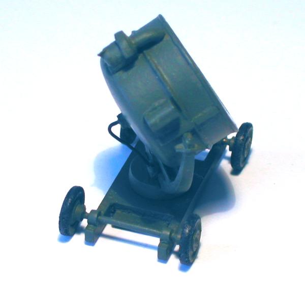 Die Lafette für den Scheinwerfer aus dem Bausatz war leider ein Klotz aus Resin, dessen Urmodell sehr lieblos zusammengeklebt worden war. Also musste auch hier ein Eigenbau erfolgen. Die Räder habe ich von einem LKW im Maßstab 1:87 abgegossen, da mir diese vorbildgetreuer erscheinen. Der Rohling des Scheinwerfers wurde noch etwas verfeinert, damit auch er einigermaßen den Vorbildfotos angenähert ist. Insgesamt sehr viel Arbeit für ein so kleines Modell, aber man ist ja ehrgeizig.