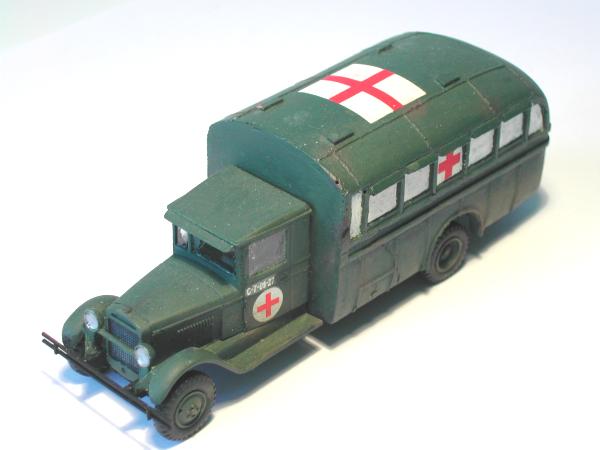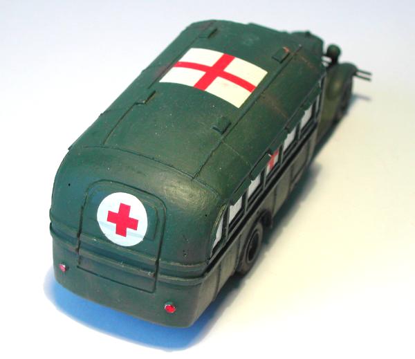 Der Bausatz aus Gießharz gehört zu den ersten Produkten von AER Modelstudio. Die Qualität ist nicht gerade berauschend, aber die Maße sind sehr gut getroffen. Vom Bausatz habe ich nur den Busaufbau verwendet, Fahrgestell usw. entstanden aus dem Spritzgussbausatz. Der Zusammenbau ist in kurzer Zeit vollzogen und das Modell steht zur Bemalung auf dem Basteltisch. Etwas Sorgen bereiteten mir die vielen "Luftlöcher" am Resinteil. Da ich zu faul war, diese alle zu verschließen, habe ich einige einfach als Beschuss- bzw. Rostschäden "deklariert". Auch Sanitätsfahrzeuge gerieten im Krieg unter feindliches Feuer und konnten Rost ansetzen.