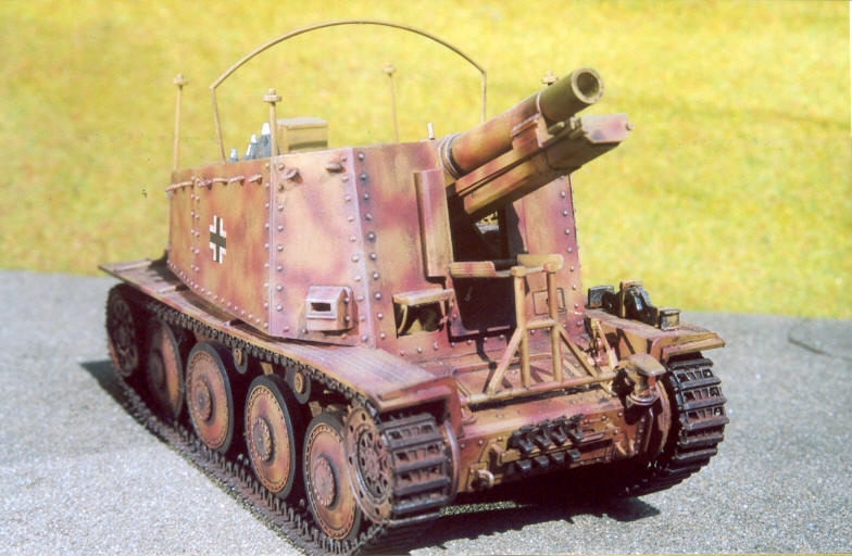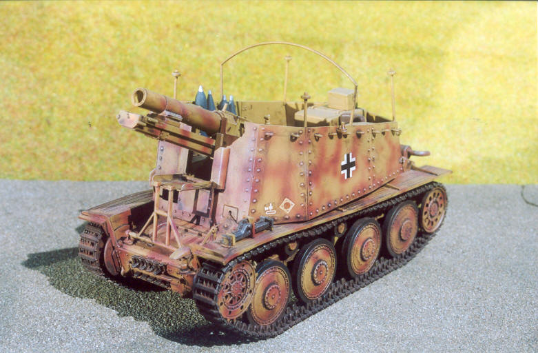 To provide fully tracked supporting artillery for infantry formations, Alkett designed a conversion based on the PzKpfw.38(t) Ausf. H chassis, using a Rheinmetall-Borsig howitzer. The gun was again located on a cross-member, bolted to the sides and front and rear plates. 90 vehicles were built on the Ausf. H chassis until the Ausf. M chassis, developed specially for this purpose, became available.