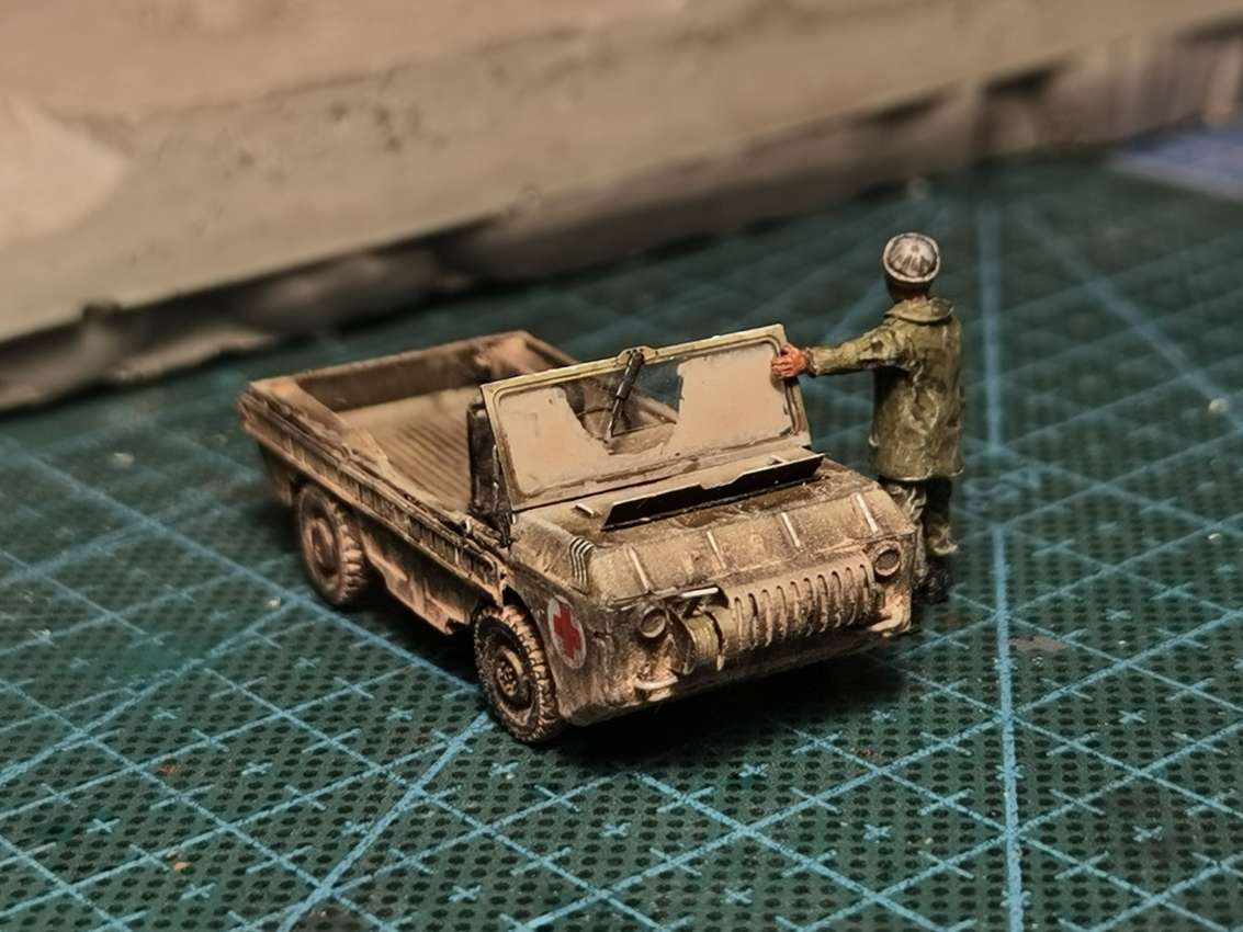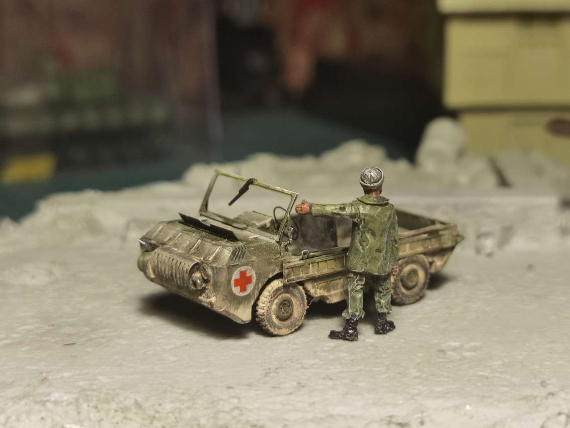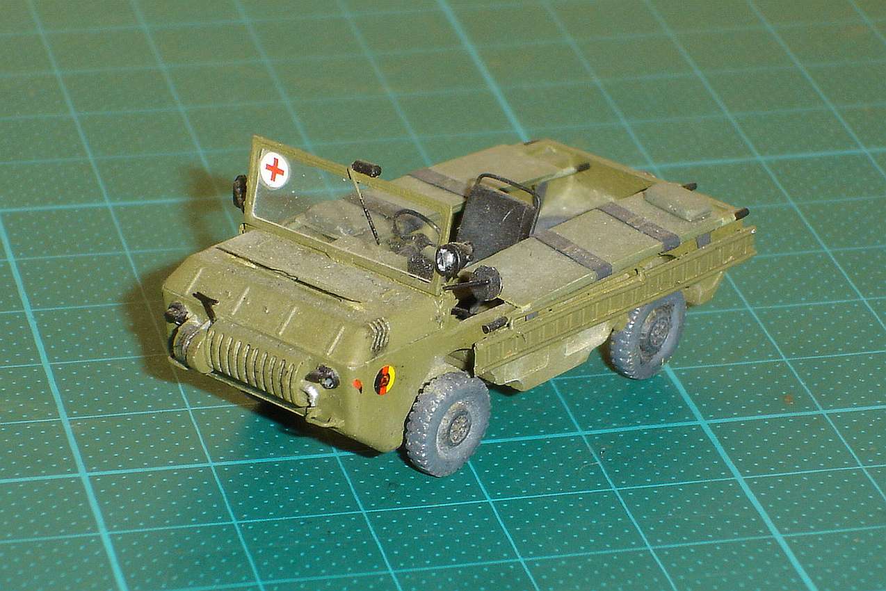 LuAZ-967 (Luhanskij AvtoZavod = Luhansk Auto Plant). The small, floatable all-terrain vehicle was used in the NVA in the medical battalions of the