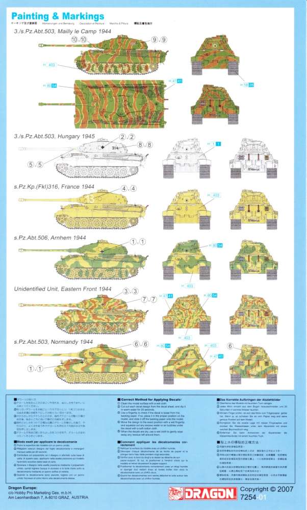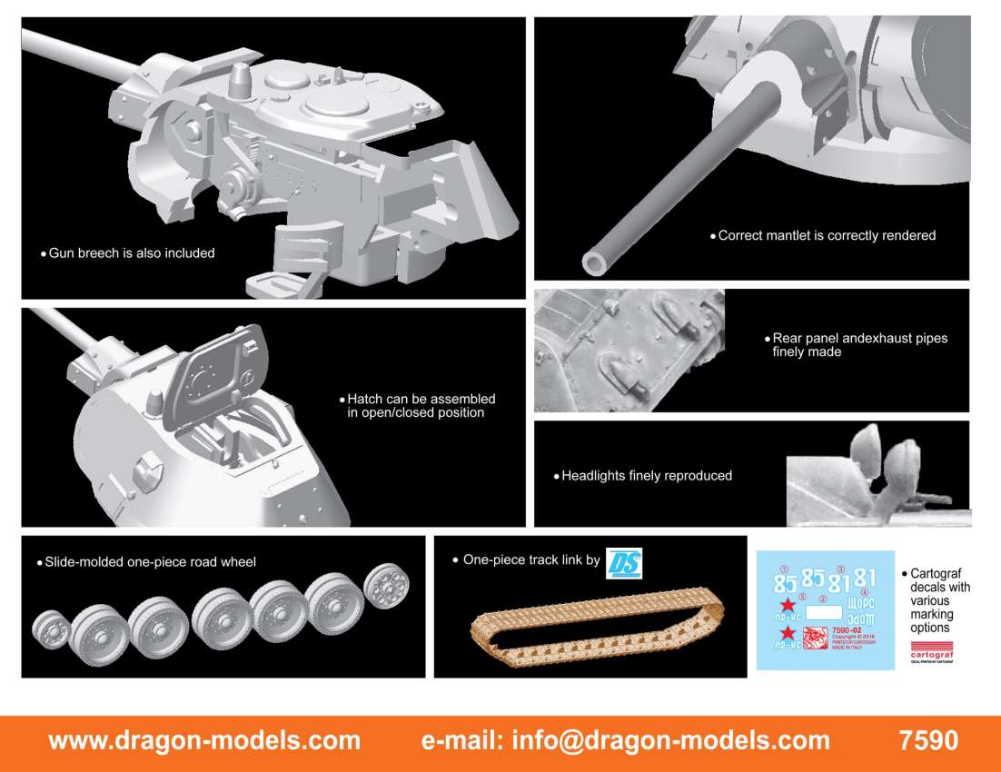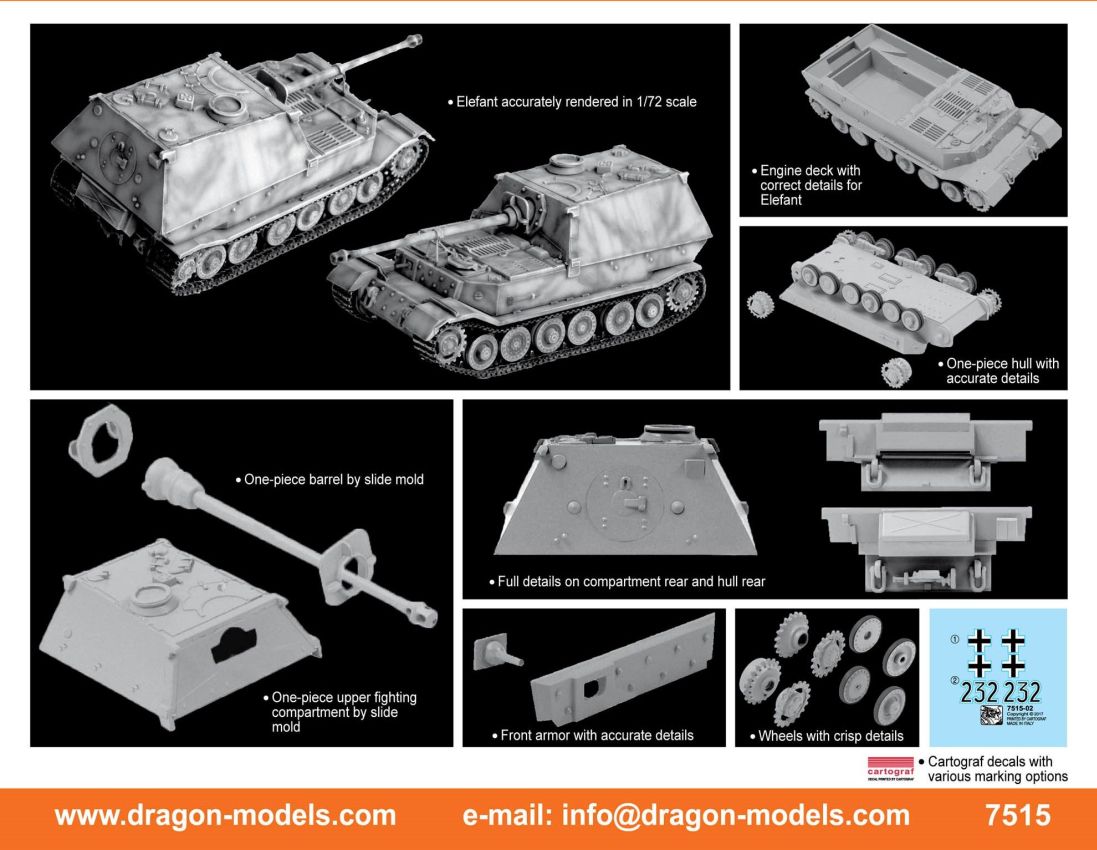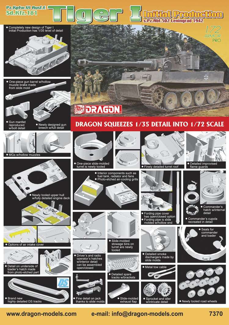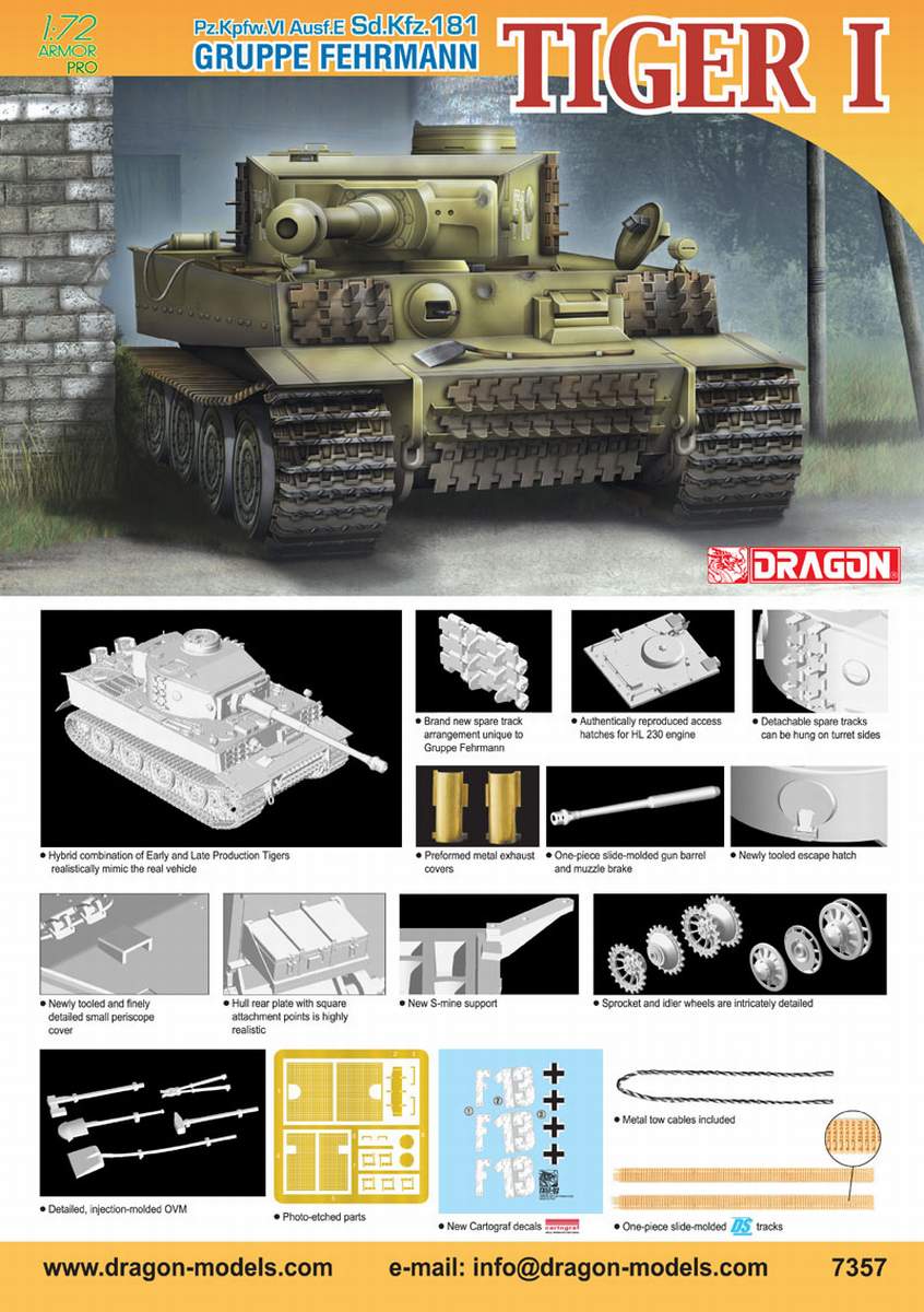 Dragon’s brand new kit appropriately portrays an Early-Production command variant of the Tiger I. Dragon had released a 1/72 scale kit of such a variant before, but it used older-generation parts. However, such a famous historical tank deserves the ultimate level of accuracy and highest quality, and that is what Dragon has done with this item. A huge amount of attention has been paid on getting all the details of this newly tooled command tank just right, and of course the Cartograf decal markings for the 88 kill marks on the gun barrel are included as well. These barrel rings illustrated the power of the Tiger I as well as the skill of tank ace Wittmann. Indeed, Dragon confidently asserts that this is the ultimate depiction of any Tiger I kit released in 1/72 scale to date.