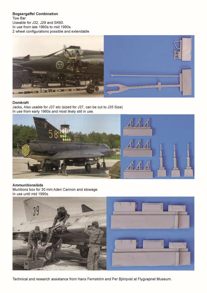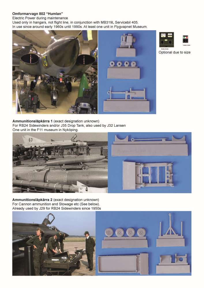 In December 2022, Gecko Heavy Industries was pleased to release via Rebell Hobby in Sweden a comprehensive 1/72 resin ground support set for the legendary Saab J35 Draken, suitable for the diorama builder. After more than 5 years of research from photos and manuals as well as contacting Swedish museum for detailed photos and measurements, it was possible to put this set together. It featured the MB319 Servicebil 405 for electronics maintenance, the Kraftvagn 745B GPU, the Hydraulprovningsaggregat 804, the Omfornarvagn 802 “Humlan” electric servicing unit, 3 jacks, two different ammo carts “Ammunitionslapkärra,” ammo boxes for Aden 30 mm cannon munitions, a fluid replenishment cart, the combination tow bar, as well as oxygen, nitrogen and compressed air carts (Syrgaskärra 873/Kvävgaskärra 875/Tryckluftkärra 8051). Some instrument panel decals and rubber tubes are provided. This really offers ALL known GSE used on the Draken as well as some other Swedish jets of that era that are large enough to be cast in resin or that where ever depicted on a reference photo. Some of this equipment was also used on Finnish, Danish and Austrian Drakens.