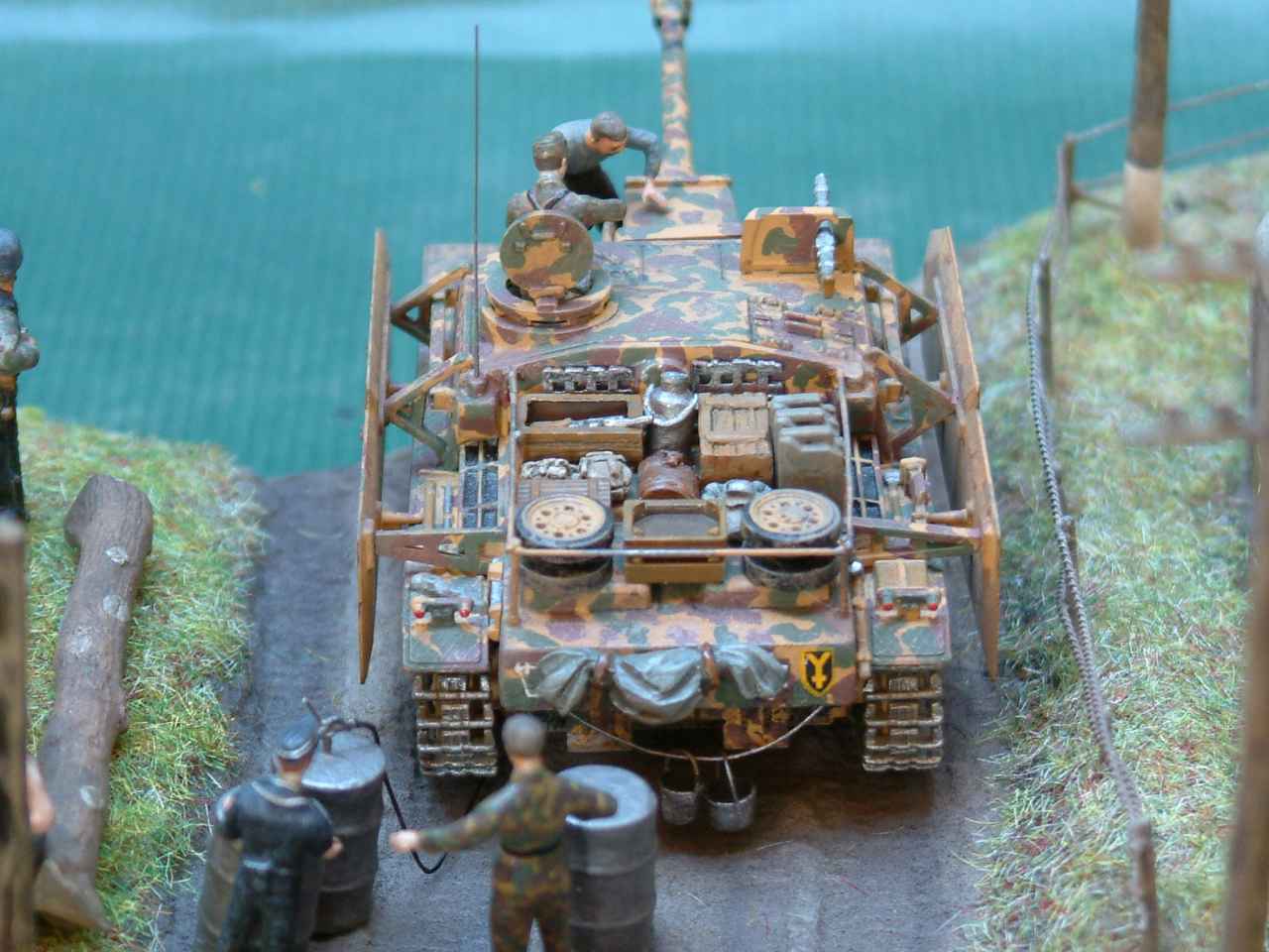 16th Panzer division and Red Cross bunker complex. This diorama shows the ESCI Sturmgeschütz and Sturmhowitzer III after I added scratch built luggage racks and the usual mess these mobile guns used to carry around. The ESCI models are great fun, and you can build two versions: the long barrel gun, which was used as anti-tank gun and has a hand painted ambush scheme to conceal the tank in the thick undergrowth where they waited for enemy tanks. The short barrel howitzers were Panzer Gray as a rule, to save paint or because it wasn’t considered necessary to re-paint them in yellow as they served in the rear of the front. Both tanks are from the late 16th panzer division, formed in France in the spring of 1943 after the early 16th PD was utterly destroyed at Stalingrad. You can tell the difference because the unit’s marking - a yellow Y - is painted on a black shield with a yellow outline as a sign of mourning for their fallen comrades at Stalingrad. In late 1943 16th PD returned to the Eastern Front where they saw heavy action until the end of the war. I thought it to be an act of kindness and mercy to depict them on holiday in Russia at a Red Cross bunker complex, even though war is never fun, judging by the size of the injection needle one of the nurses is about to use, one the soldier having second thoughts. The Phanomen Granit 27 ambulance is a JV Model resin kit, donated by Lancier hobby shop in Gouda for the benefit of my pleasure of building this kit, thanks again! The figures are from Preiser and ESCI, except for the nurses, who are of unknown origin as I got them from a boy in my neighbourhood when I was six years old.