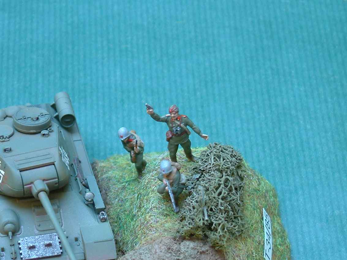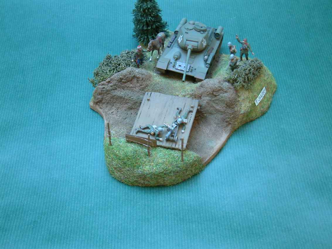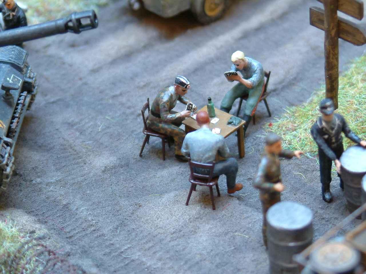 This is a diorama with the Revell Panzer IV, built at about the same time I made the T34. At that time, I had just bought my Aztec airbrush and I was so proud of its paint job, that I didn’t dare to do any washing or weathering of these tanks out of fear of messing it up. One shouldn’t fear showing one’s mistakes, and quite honestly; some things are wrong with this diorama. First of all, I couldn’t decide between summer markings and winter markings? I decided on winter markings and the light tan colour you see should have had a white weathering of paint over it. Should have…but then I decided on a summer diorama as I had no Germans in winter uniforms at that time, oh well. To make things worse, I had planned on a road with nicely arranged pebbles at each side or the road. When my wife saw the finished product, she burst out in laughter and said: “Honey, it looks like a vacation resort; it’s German Disneyland!” Wives are the most destructive critics in the world to a man’s ego, most of all when they are speaking the truth. This diorama has since that day been known as the German Vacation Resort; thanks Hylda!