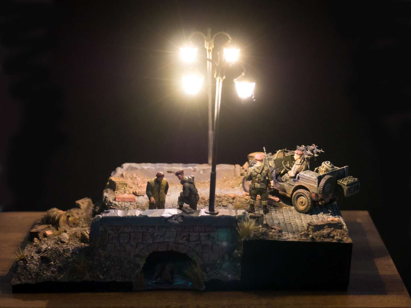 scratch building. He used a Black Dog resin bridge for the Diorama and added working city lights.