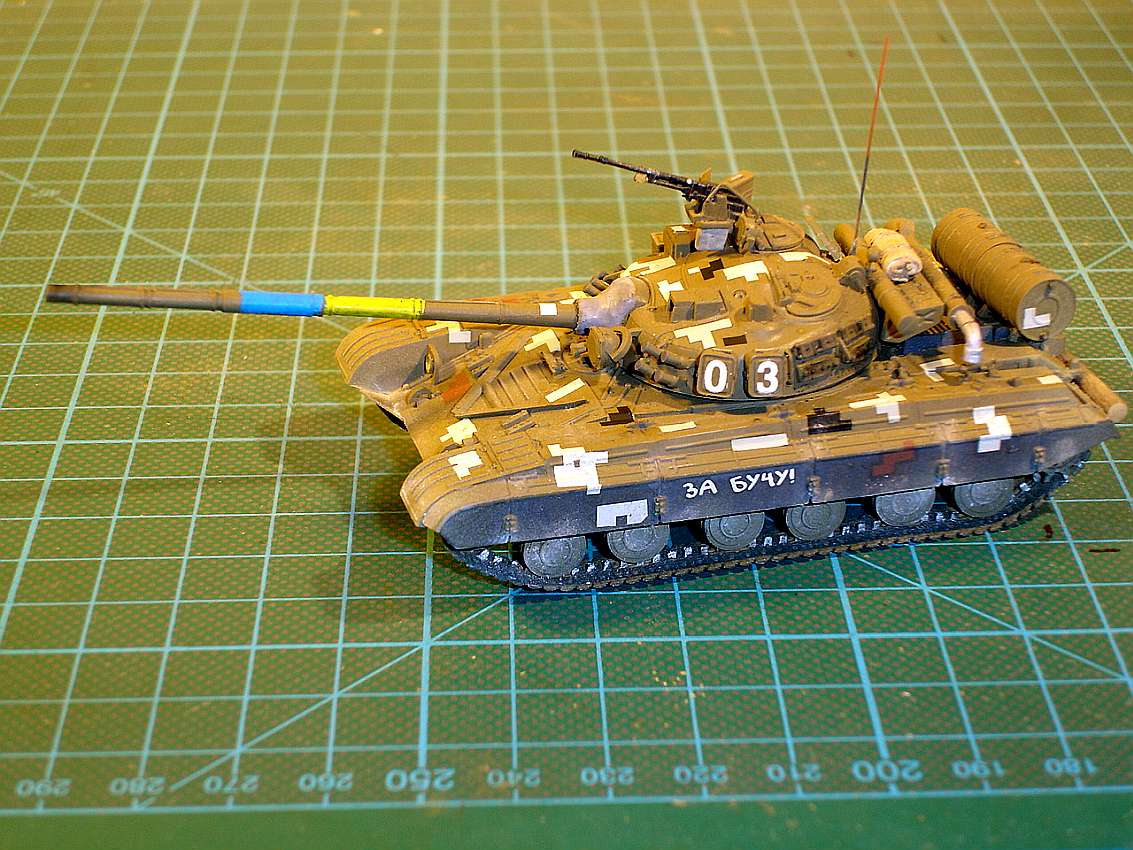 A T-64 in the colors of Ukraine. The pixel camouflage is decals from the new editions of the ICM truck models (URAL, ZiL), which are delivered under the slogan