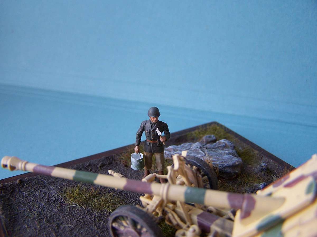 Added some scratched parts (Left part gunshield, paint bucket and brush). The big rock was plaster cast from a latex mold I made from a piece of tree bark. The mud on the guncarriage was made from pastel chalk in turpentine, which came out fairly decent.
