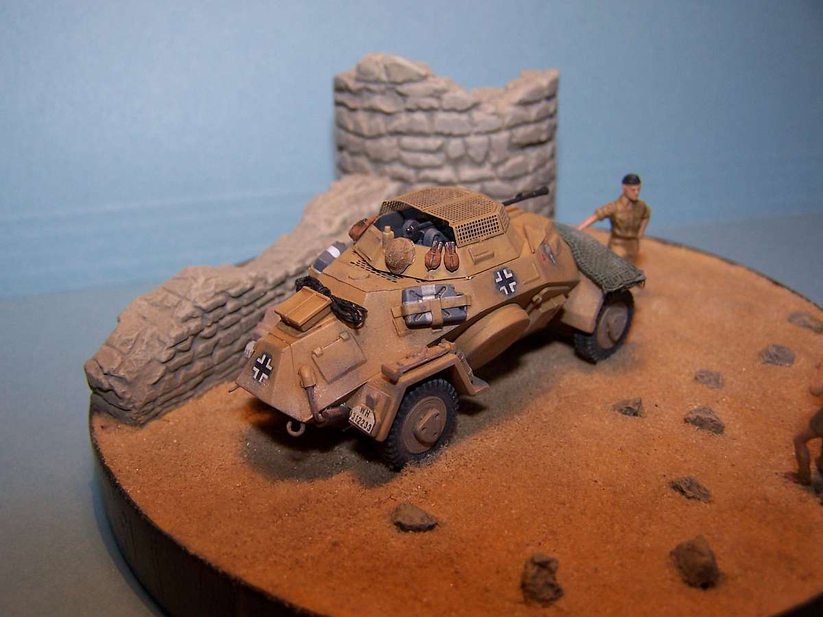 Added some details to the vehicle and replaced the head of the figure leaning on the vehicle. The wall and tower ruin are made from plaster. I really like the kit of the 222 it comes together really great and has separate wheels and hubs, which is very convenient for painting. Overall it came out pretty nice except that the figure taking the photo seems to be standing rather odd.